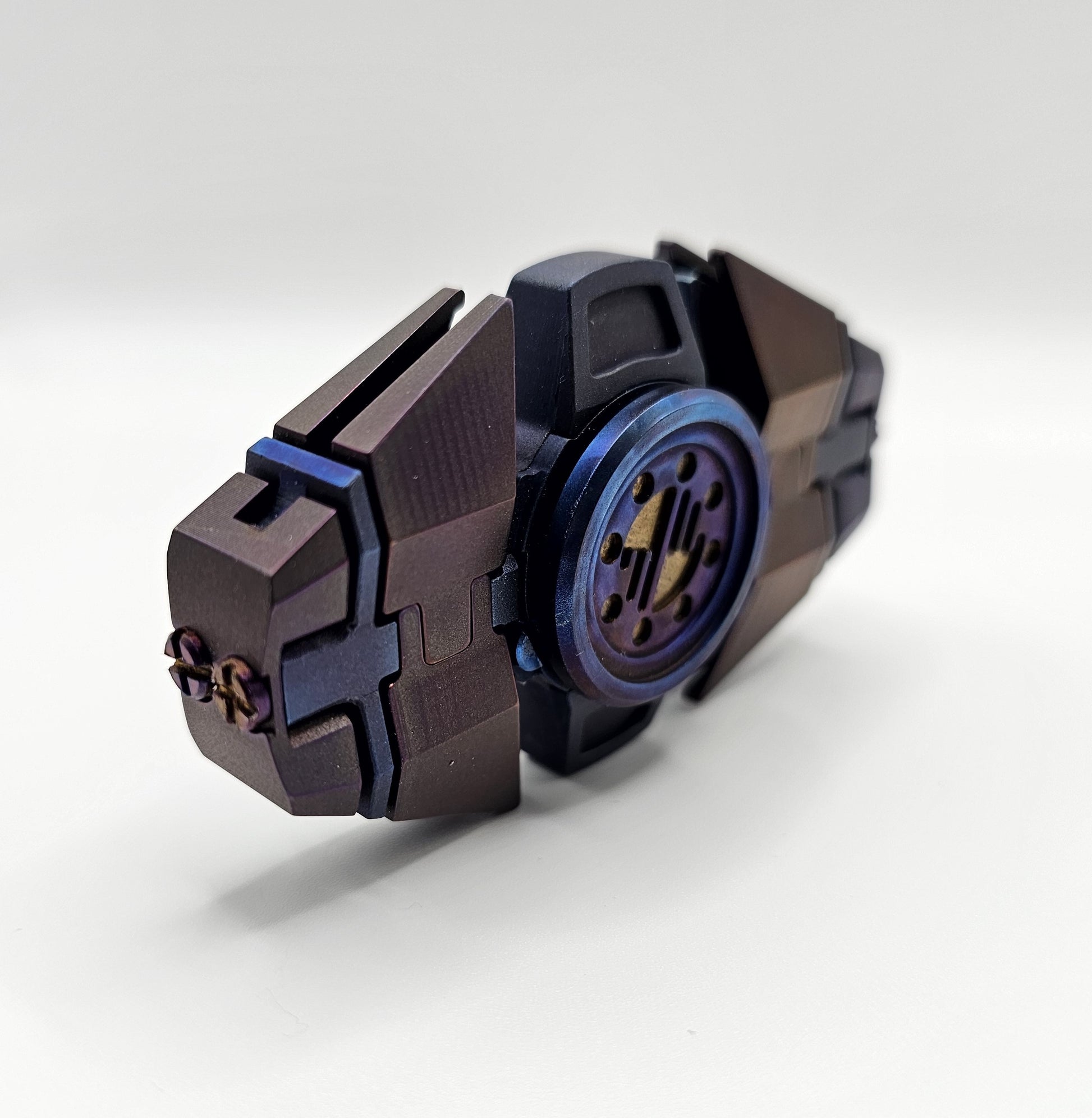 Full titanium M-Type fidget spinner. This is our most complex piece. Each fin on the outside of the spinner contains a spring. Each fin can be compressed individually. It is perfectly balanced for beautiful spinning. Colors will be as shown in images. Contact to request special finishing.