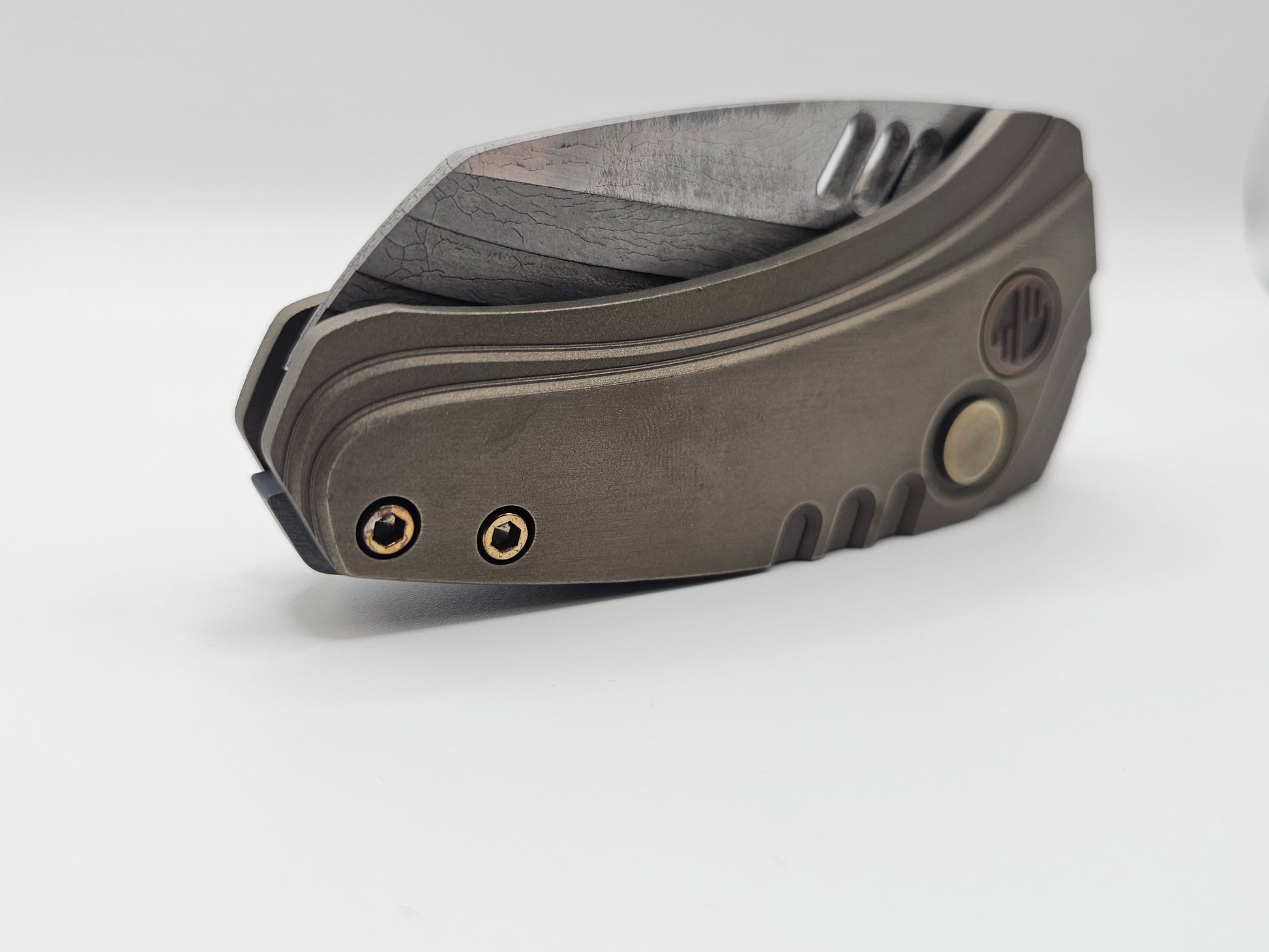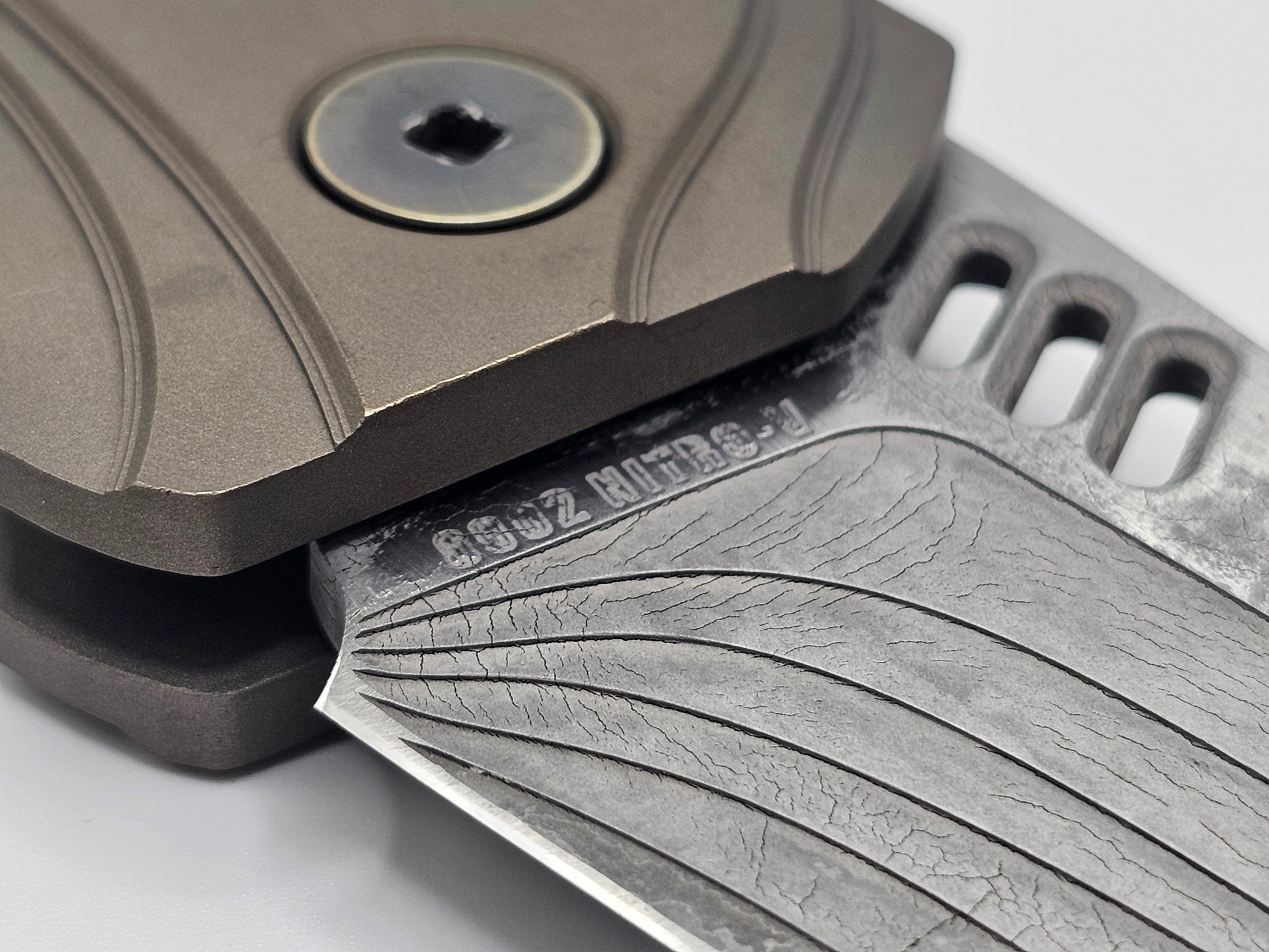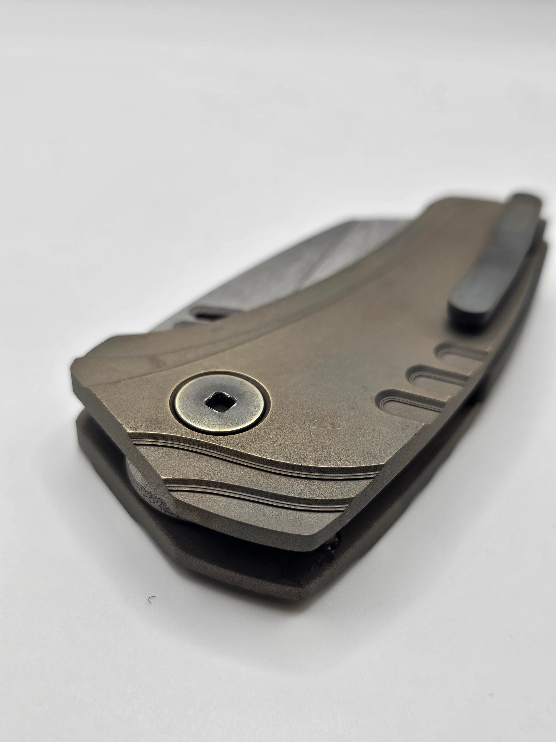 - Sandblasted, distressed, then bronzed anodized 6AL-4V Titanium handles